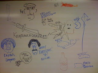 I cannot argue that these are very functional gifts. I'd even bet that they are rather pricey. Still I don't have a duffle to put in my bag, nor would I know where to buy a duffle to place in there. The walking stick, however, has already come in very useful. I have walked all the way to the copier and back without falling. Imagine! Whatever did I do before. I can't even remember my life before my walking stick. Even more, I beat of three undesireable artists and one list of things to do. I already have plans, once I am an old fart, to shake it at neighborhood kids and scream off my porch, "get off my lawn!"